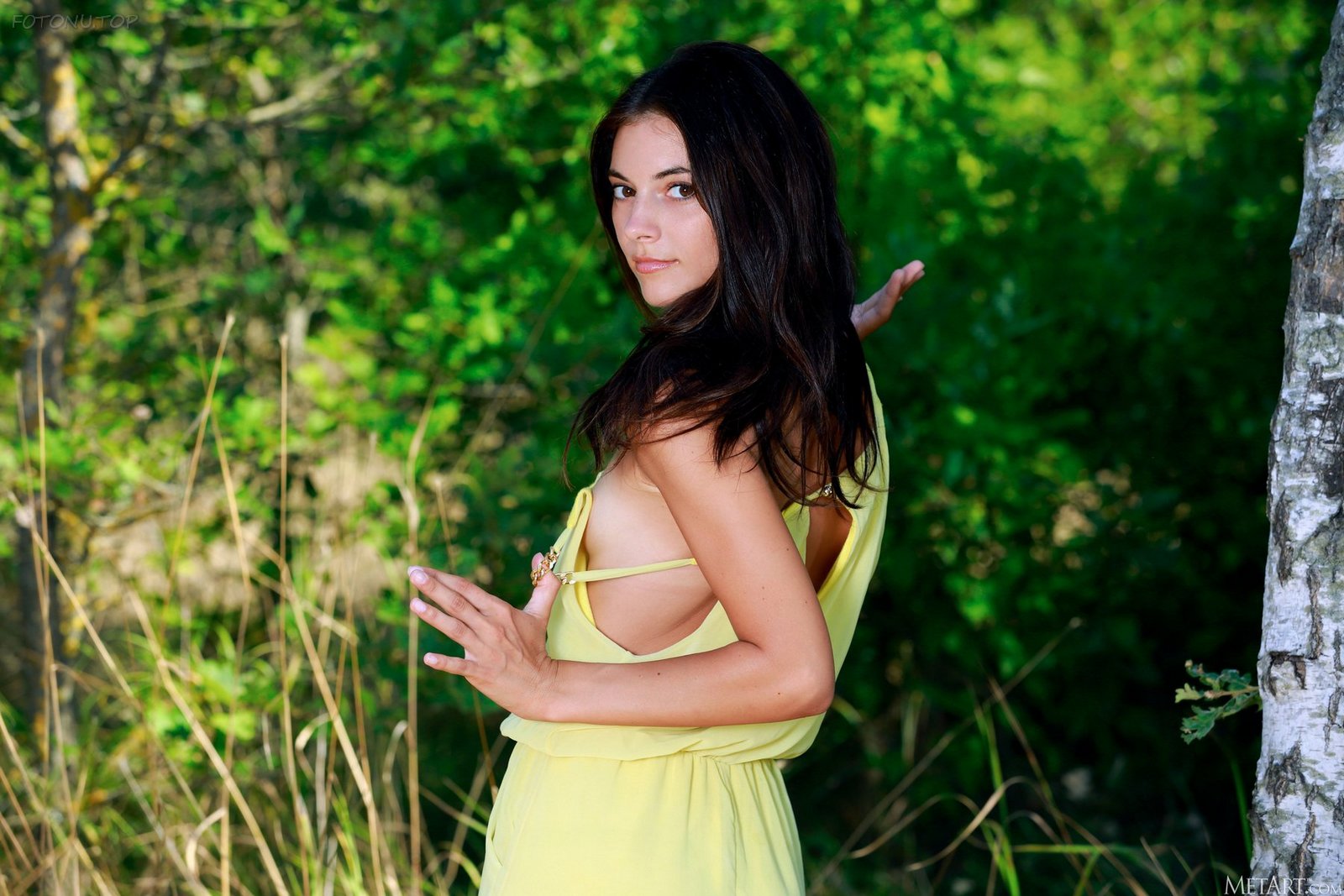 Описание: В теплую погоду симпатичная девушка с темными волосами пошла на природу в желтом платье и там разделась догола возле дерева, открывая красивые виды на свою маленькую грудь с торчащими сосками и бритую письку. Эта милашка брюнетка без стеснения активно позирует на свежем воздухе, показывая загорелое тело и играясь с щелкой, в которую так сильно любит засовывать шаловливые пальчики.