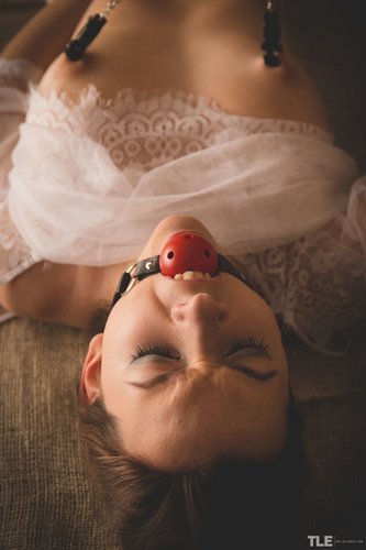 Описание: Эта молодая телка в эротическом прозрачном белье обожает бдсм секс. Ей нравится, когда ее связывают или пристегивают, а затем насаживают на каменный пенис. Но сейчас милашка с кляпом во рту шалит со своей мокрой писькой на кровати. Цепляя прищепки на сосочки, возбужденная шалунья ласкает упругие сиси, после чего засовывает руку в трусы и теребит мокрую киску до получения сильного оргазма.