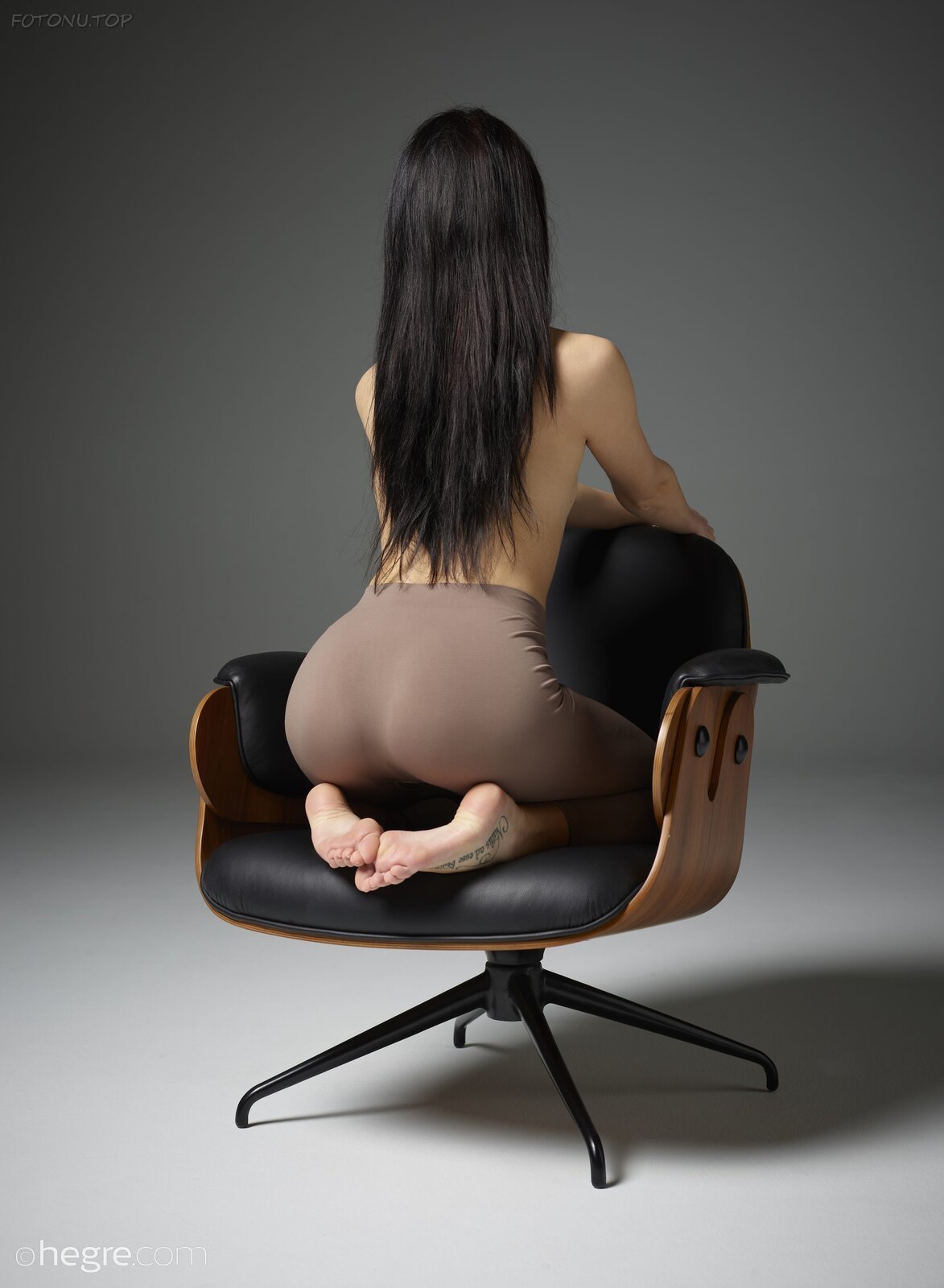 Молодая брюнетка в лосинах светит красивой попкой в кресле